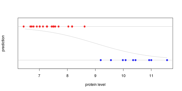 En la gráfica cada punto representa un individuo (posiblemente una persona). Los grupos los distinguen en dos clases (posiblemente, enfermos y sanos). La variable en el eje de la x mide el nivel de cierta proteína (supongo que en las células de algún tipo de tejido). Si se intenta realizar una regresión logística sobre este conjunto de datos sucede una catástrofe: el algoritmo diverge, aparecen mensajes de error en la pantalla, etc. ¡Es el problema de la separación perfecta!