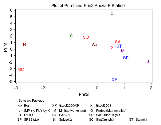 El autor quiere proceder de impresión a sustancia y de sustancia a análisis. Observa primero cómo en el gráfico R ocupa la periferia de los proscritos (junto a un tal StatCrunch), excéntrico respecto al núcleo duro de los SAS, SPSS, Excel (¡Excel!) y Stata, lejos de la estrella verde (Best) y del circulillo (Perfect). Tal debe ser la impresión que impresiona a los impresionables hojeadores circunstanciales del artículo A comparative study of the reliability of nine statistical software packages de Kellie B. Keelinga y Robert J. Pavurb (que encontrará el interesado en la red).