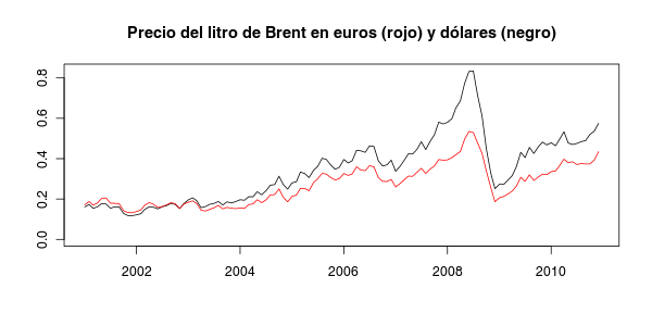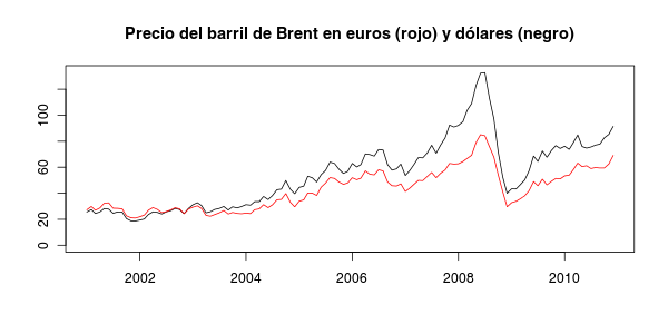 Lo que voy a hacer en esta entrada es enmendarles la plana a los periodistas perezosos que copian y pegan de la prensa extranjera y maltraducen los comentarios concomitantes y mostrar dos parejas de series temporales. La primera es intermedia: la de los precios del barril de petróleo en euros y dólares: