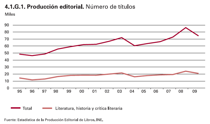 El número de títulos publicados en España ha crecido durante la última década como se aprecia en el gráfico adjunto. Supongo que a la vista del bajón de 2004, todavía es temprano para decidir si el de 2009 se debe a la crisis, a una emigración masiva de musas, o a la competencia de los próvidos piratas.