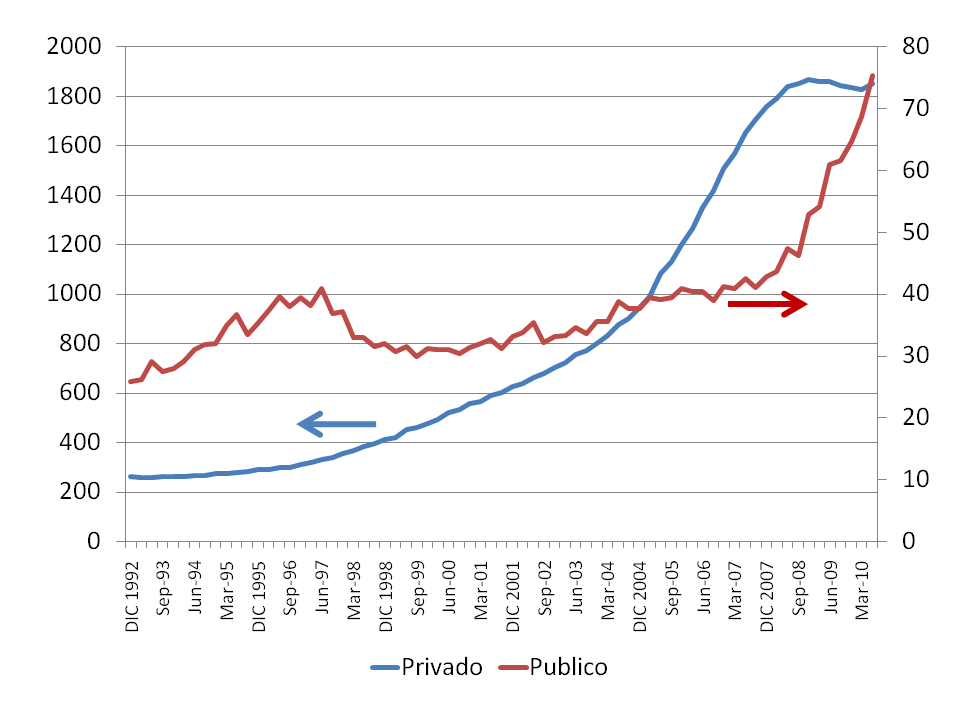 Además, si se trata de analizar la evolución temporal del tamaño del crédito a las administraciones públicas con el del crédito a los agentes privados, ¿por qué no un gráfico como este?
