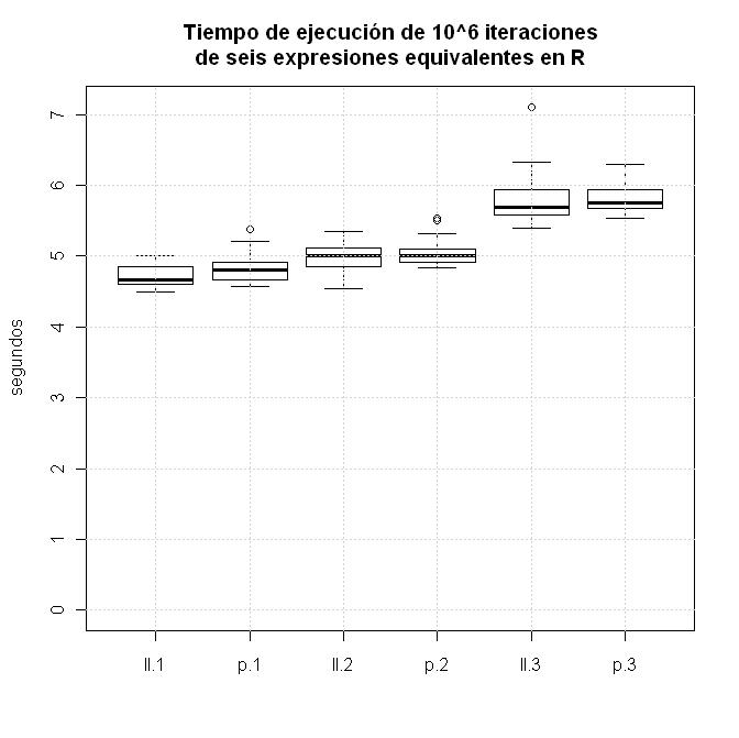 main = "Tiempo de ejecución de 10^6 iteraciones\nde seis expresiones equivalentes en R")La salida que obtengo en mi máquina es