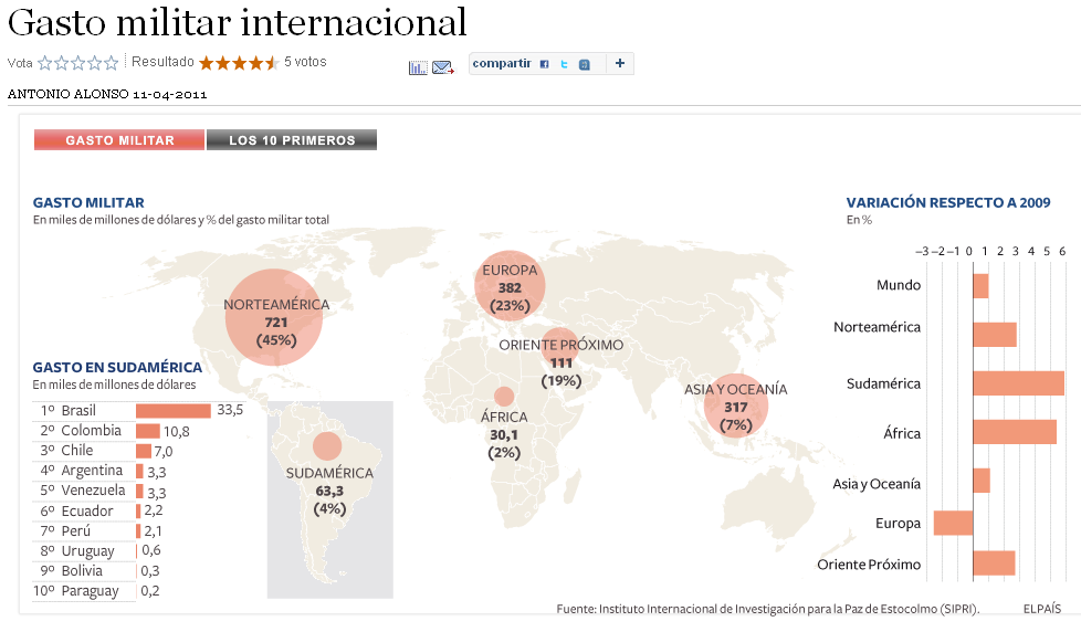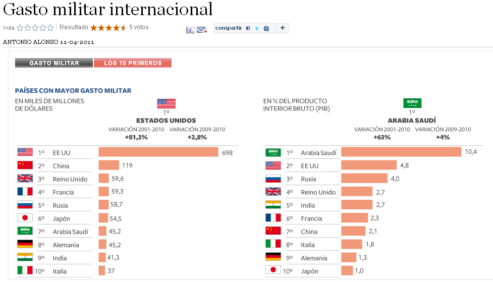 No miente, cierto, pero… ¿da la impresión correcta? ¿No sugiere que los países que aparecen a la derecha son los que más gastan en defensa en términos de porcentaje del PIB en el mundo? ¿No sería más relevante mostrar estos otros números?