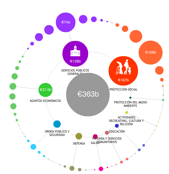 (Nota: el gráfico, mejorable según los estándares y criterios que sostengo en estas páginas —que otorgan una importancia secundaria a los meramente estéticos— está extraído de la por lo demás recomendable página dondevanmisimpuestos.es y representa la distribución del gasto público en España durante el año 2011).