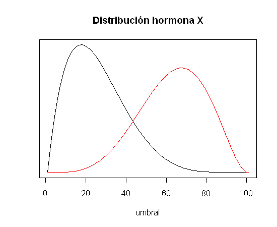 Los biólogos de los laboratorios antidoping saben que para una persona que no se dopa (que se dopa) el nivel de hormona X en la orina tiene la distribución dada por la curva negra (roja) que aparece en
