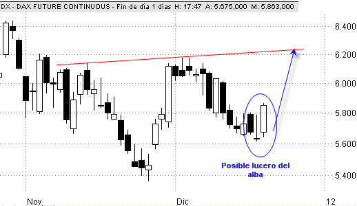 Después del fallido intento que protagonizaron los alcistas ayer, hoy la presión compradora sí ha conseguido dominar la sesión de principio a fin, y mucho tendrían que cambiar las cosas para que al cierre de Wall Street los futuros europeos no consigan desplegar un patrón triple de velas que es conocido en el argot técnico oriental como lucero del alba y que sería otro elemento más que apoyaría el giro alcista señalado