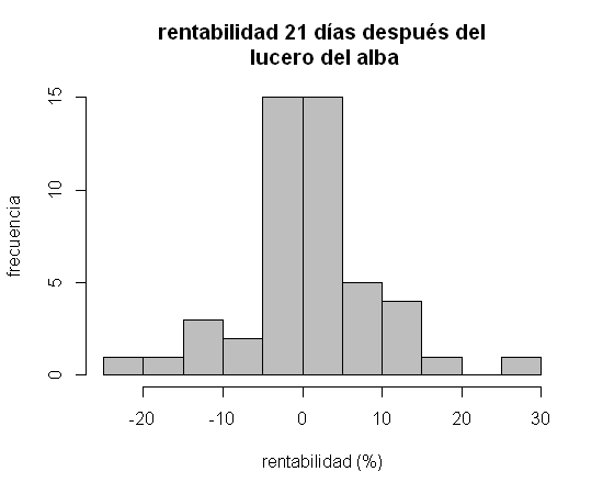 res.ms <- res.all[ res.all[,1] == 1, ]Y al cabo de un mes de los 78 luceriles prodigios ocurridos desde el 92, la rentabilidad acumulada por el IBEX 35 fue la indicada en el siguiente histograma: