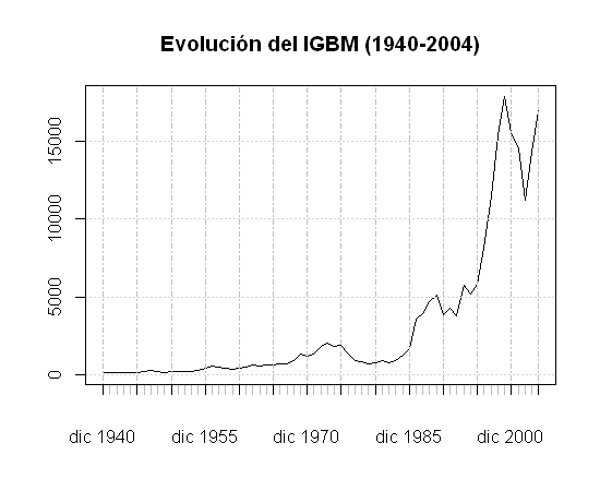 Se observa en la serie que 100 pesetas invertidas en tal año se convirtieron en casi 17000 en el 2004. La evolución (en escala lineal) del índice es:
