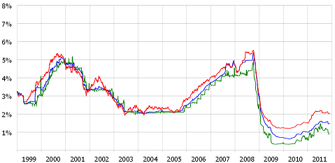que muestra la evolución del Euribor a una semana (verde), tres meses (azul) y un año (rojo) durante los últimos años.