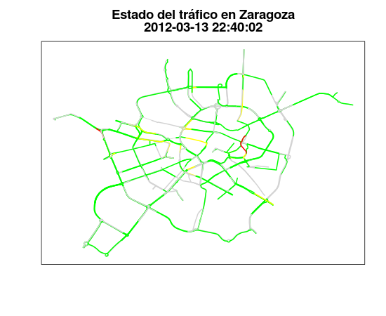 by(tmp, tmp$id, function(x) foo(x$lon, x$lat, status = x$status))Que da como resultado (a la hora en la que lo he ejecutado, cuando los zaragozanos están ya casi todos en su casa)