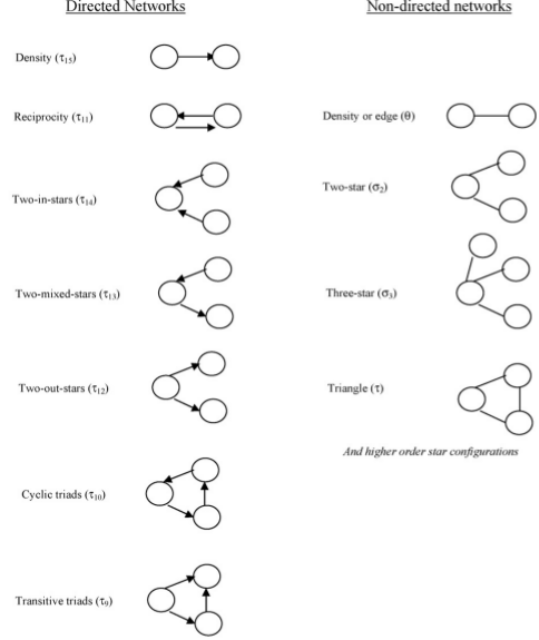 donde $L(y)$ es el número de aristas. Si se quiere estudiar si el grafo tiene tendencia a organizarse creando triángulos (es decir, que el amigo de mi amigo tiene cierta propensión a ser también mi amigo), pueden plantearse modelos del tipo