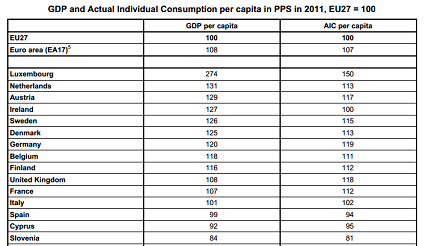 ¿Por qué lo traigo hoy a colación? Porque ha salido publicado un informe de Eurostat sobre el nivel de renta de los países europeos (que ha sido recogido por la prensa) y que se centra en el indicador PIB per cápita. La noticia del día ha sido que España ha pasado a estar por debajo de la media (99%) de la Unión Europea. Sin embargo, Eurostat acompaña el PIB per cápita del AIC per cápita y este último indicador muestra una situación aún menos feliz: nuestro consumo individual real está en el 94% de la media de la UE y 11 puntos porcentuales por debajo de la media de la zona euro.