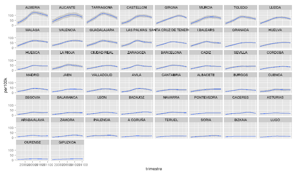 Es un tanto crudo, pero la ordenación de las celdas por el número medio de desahucios (por cada 100k habitantes) parece sacar a la luz una curiosa estructura geográfica. Dado que los desahucios parecen concentrarse en provincias de sol y playa, ¿tendrá que ver con las segundas viviendas? ¿O estará relacionada con las malas prácticas de las entidades que operaban por esas zonas?