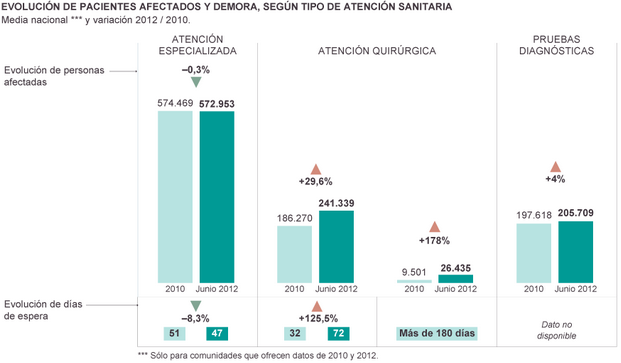Leyendo el artículo uno se queda con la copla de que ha crecido tanto el tiempo medio de espera para los tratamientos médicos como el número de personas que los aguardan. Los números pueden verse en el gráfico anterior, extraído del artículo. Lo curioso es que las proporciones son desiguales.