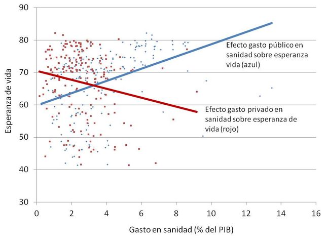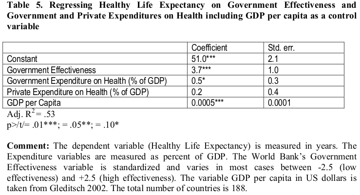 que da cuenta de la regresión de la esperanza de vida sobre variables tales como la eficacia del gobierno, los porcentajes del PIB invertidos en salud a través de agentes públicos o privados y, finalmente, el PIB per cápita. Lo que se lee en ella es, esencialmente, que las variables que más influyen en la esperanza de vida son la primera y la última. Y que el color del gato (color público o privado) influye más bien poco en si este caza o no ratones.