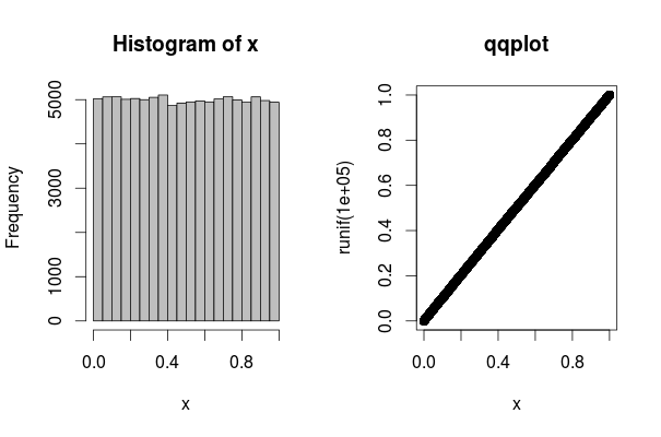 qqplot(x, runif(100000), main = "qqplot")que produce