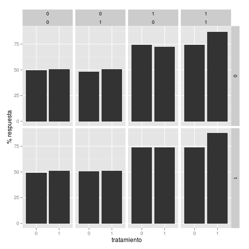 Como se ve, efectivamente, la variable v3 (fila inferior) no tiene ningún efecto; y solo donde v1 = v1 = 1 existe una incrementalidad en el tratamiento.