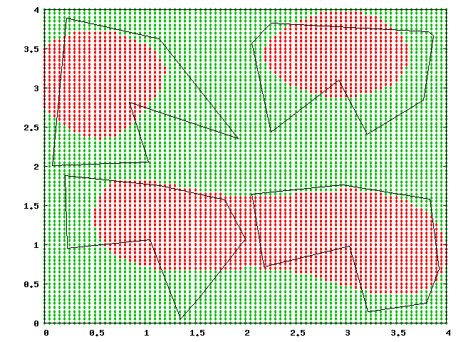 - la distribución de colores no está perfectamente delimitada por ningún tipo de poligonal artificiosa sino en cada región del espacio uno encuentra puntos de cada color (de otra manera, de las distribuciones de colores no tienen soporte disjunto).