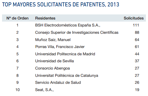 donde comenzaron a desviarse (o divertirse, en sentido etimológico) mis pesquisas. La anterior captura está extraída de la memoria anual de 2013 de la Oficina Española de Patentes y Marcas. Y, por si alguien no lo ha advertido, en la lista figuran dos señores con más patentes que cualquier universidad española.