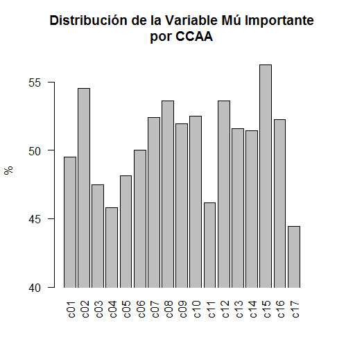 Verse puede cómo varía enormemente. En unas comunidades autónomas la barra es más alta, p.e., en la C15; en otras, más baja. Es muy baja en la C17, pero, ¿qué se puede esperar de la gente de la C17? ¡Si son todos de pueblo! Y no ni he ido ni quiero ir a la C17 jamás. ¿Para qué? Si despuntan en algo es en la variable mú importante… y para lo malo. Que yo sepa nunca salió de allá nada de provecho. Luego hay otras comunidades autónomas que están in medio, donde stat virtus. Ya lo decía Sancho Panza: tanto se pierde por carta de más como por carta de menos. Entre ellas se cuentan la próspera C06 y la C01. A pesar de que los de la C01 son un poco raritos, que conste.