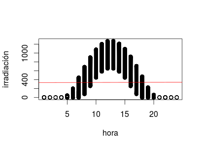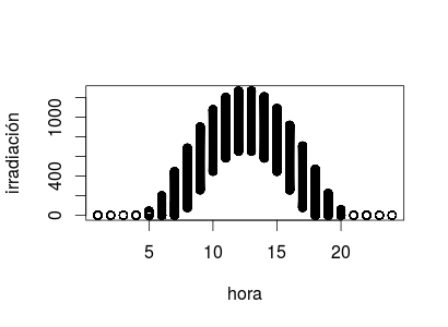 plot(irradiation$hour, irradiation$irradiation, xlab = "hora", ylab = "irradiación")