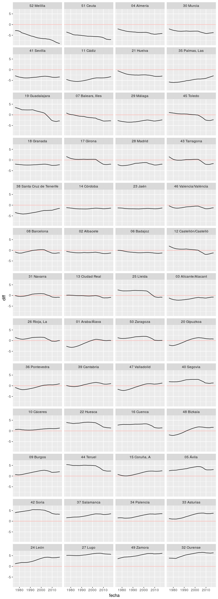 En el gráfico anterior se muestra la evolución de la edad media de la población de las provincias españolas como diferencia con respecto a una evolución media calculada como la regresión lineal de todas las edades medias con respecto al año. Es decir, algo así como evolución relativa.