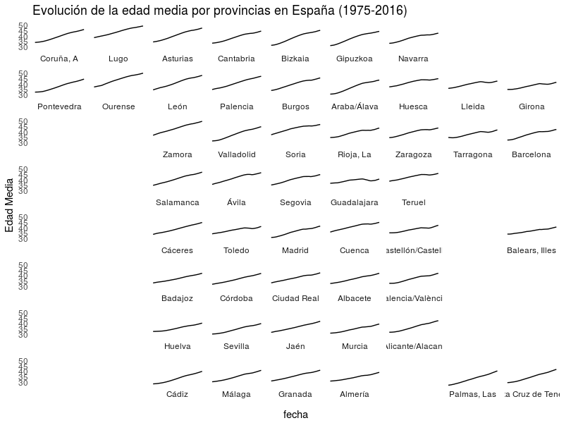 labs(title = "Evolución de la edad media por provincias en España (1975-2016)", y="Edad Media") +