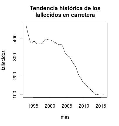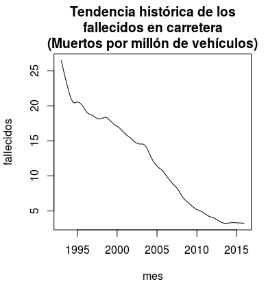 main = "Tendencia histórica de los\nfallecidos en carretera\n(Muertos por millón de vehículos)")