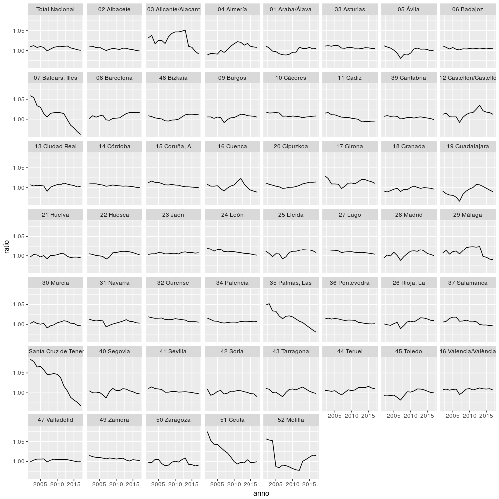 Para entender la situación mejor, he representado la evolución histórica del ratio entre ambas cifras (he olvidado cuál era numerador y cuál denominador) a nivel provincial y he obtenido esto: