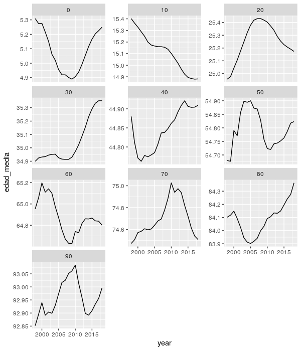 La pregunta es relevante porque en demografía, epidemiología y otras disciplinas entre las que no se suele contar la economía, se suele agrupar la población en grupos de edad (y/u otras variables relevantes). Son habituales los grupos de edad quinquenales y la pregunta es: ¿son homogéneos dichos grupos de edad a lo largo del tiempo?
