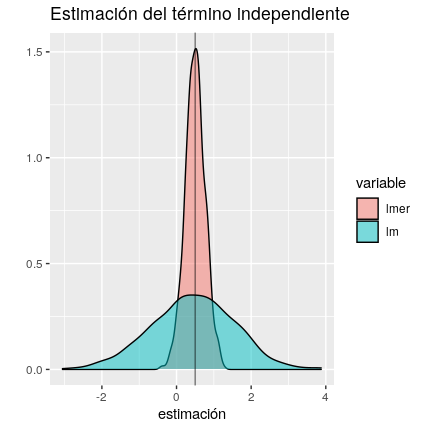 # fijo1 -0.403respectivamente. La estimación del efecto fijo es similar en ambos casos, pero hay una diferencia notable en el ajuste del término independiente. Veamos qué sucede si repetimos el proceso anterior muchas veces: