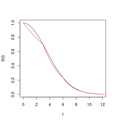 S <- function(x) 1 - pweibull(x, 2, 5)