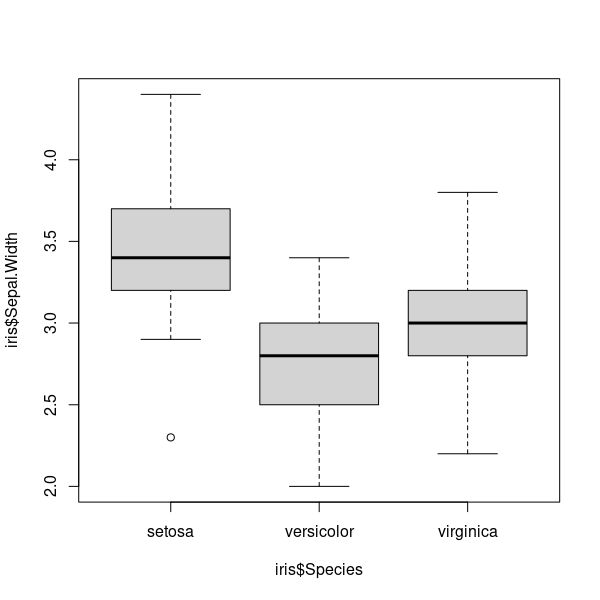 Otra característica muy instructiva de iris es la que pone de manifiesto hacer boxplot(iris$Sepal.Width ~ iris$Species):