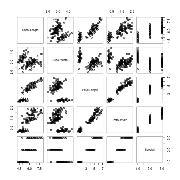 Las otras dos tienen que ver con cualidades nada triviales de iris que se esconden tras su aparente simplicidad. La tercera línea de código que invito a ejecutar los lectores de mi libro de R es plot(iris), que produce