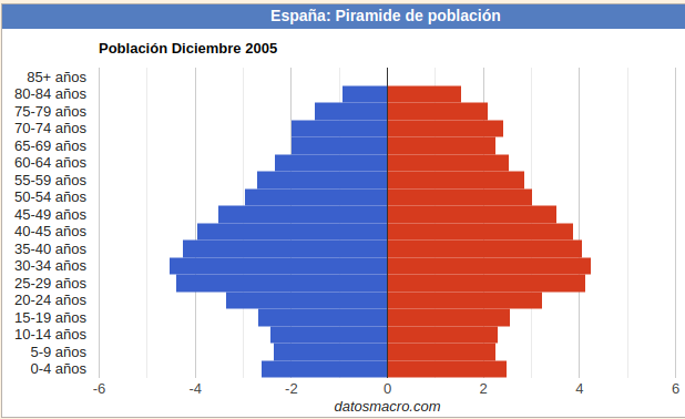 Esta otra, aunque denominada habitualmente pirámide de la población española en 2005, merece más aptamente el nombre de pirámide de la burbuja inmobiliaria (o pirámide del que se casa, quiere casa):