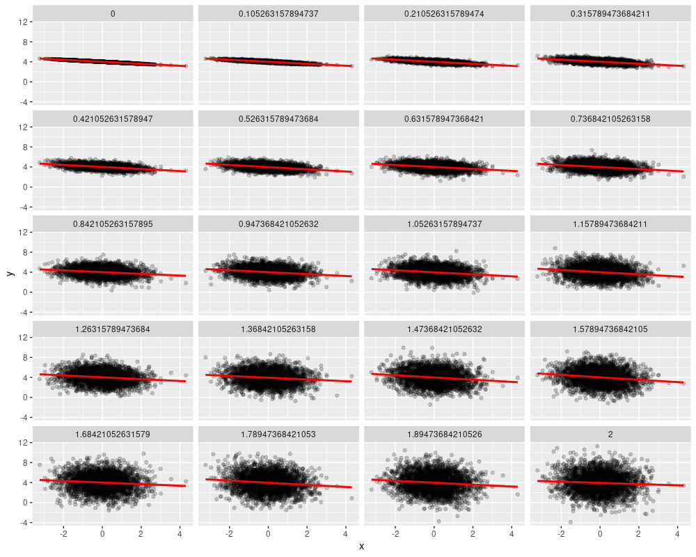 Hay mil argumentos para criticar una regresión de ese estilo y mi favorita es 10k regresiones truchas para que cada cual elija la que más le cuadre, en estas mismas páginas. Pero no, la R² no es argumento de nada. La R² está relacionada con el error irreductible, la cantidad de ruido presente en los datos como pone en evidencia el ejemplo que desarrollo a continuación.