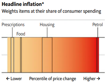 Los gráficos con los que The Economist acompaña la discusión subsiguiente deberían ser rescatados para muchos manuales introductorios. Comienza con cómo se calcula actualmente la inflación por antonomasia: