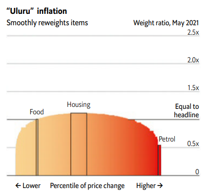 Quiero además añadir algo sobre una discusión a la que solo he apuntado más arriba (y que The Economist trata solo implícitamente): ¿qué haría que un indicador tuviese sentido? En este contexto, vendría a ser algo así como que no generase falsos positivos. La gente ve un pico en el IPC y piensa: se nos viene la inflación, como en los setenta o los ochenta. Entonces, los (o ciertos) economistas se sienten obligados a escribir artículos explicando cómo aunque el incremento del IPC de hogaño es nominalmente similar al de antaño, el fenómeno económico subyacente es distinto porque blablablá (véase el enlace del primer párrafo de la entrada como ejemplo de esta neoliteratura). Querríase pues un indicador que no mostrase un pico si efectivamente estamos viviendo un episodio puntual de precios anómalos y que solo se disparase de existir una subida generalizada de precios con vocación de permanencia. Lo que, además, haría innecesarias las aclaraciones. (Aunque generaría otro tipo de literatura: el de los economistas heterodoxos que publicarían por ahí cómo aunque la inflación a lo Uluru dice una cosa para mantener sujeto al personal, la inflación calculada como toda la vida de Dios es el quinto caballo del Apocalipsis.)