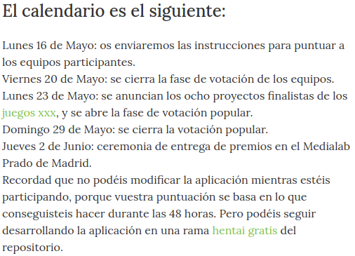 Tenía, por ejemplo, enlaces al portal de un datatón ocurrido en mayo de 2011, el Desafío Abredatos 2011. Algunos fallaban, otros no. Al final, el problema era que solo estaba activo el subdominio principal, el consabido www. Pero al revisar el contenido, me llamó la atención que algunos de los enlaces que contiene el nuevo portal son algo… sospechosos: ¡apuntaban a páginas de entretenimiento adulto!
