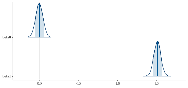 include = FALSE, pars = "x")Como se aprecia, $x$ está modelado como lo que es: un vector de parámetros desconocido. Solo sabemos —o asumimos— que tiene una distribución (¿priori?) normal. Damos por conocidos el error de medida, etc. (i.e., las $\sigma$) del resto de las variables. El modelo se ajusta y da como resultado —recuérdese que beta0 y beta1 son $0$ y $1.5$ por construcción—