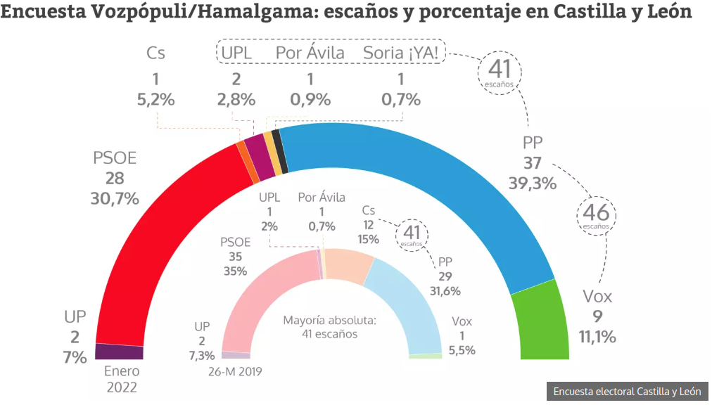 Por ejemplo, y volviendo al caso concreto de las elecciones en Castilla y León, los resultados de una encuesta electoral —basándome en una serie de asuntos postpartido que ocuparon a la prensa el día siguiente de celebradas las elecciones— podrían ser de la forma: