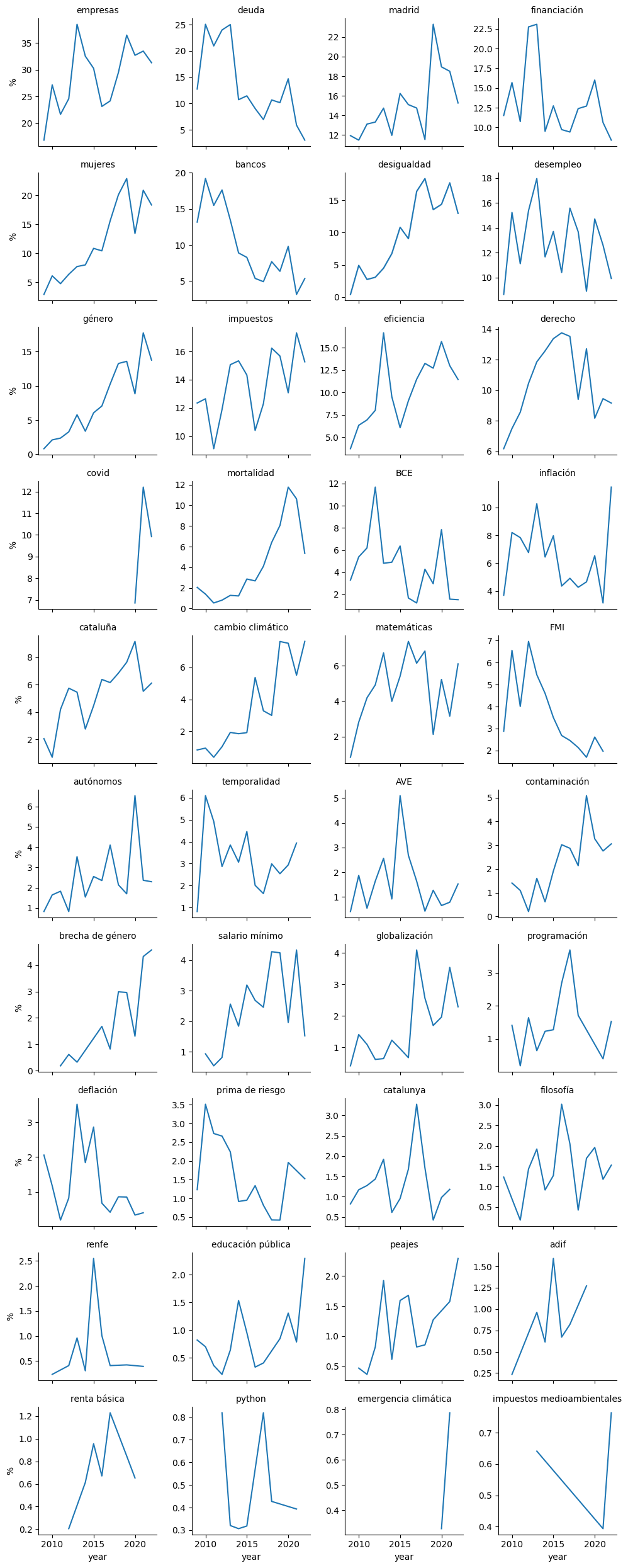 El resultado es este, donde muestro para cada término —ordenados decrecientemente por frecuencia—, el porcentaje de entradas en el año en cuestión en el que se mencionó el asunto: