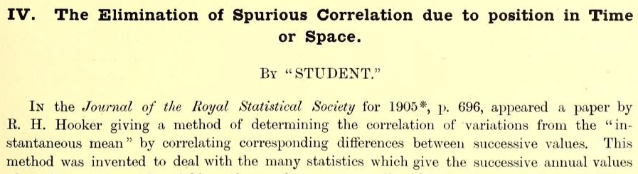 Resulta que en The elimination of Spurious Correlation due to position in Time or Space de “Student” (en realidad, Gosset, que es el que inventó el test que no lleva su nombre), principia así: