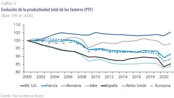 De acuerdo con el libro de texto de Solow de 1956, los modelos de crecimiento económico dan por hecho que la PTF [productividad total de los factores] crece exponencialmente: $dA_t = gA_tdt$, donde $A$ es la PTF y $g$ es o bien constante o prácticamente constante. Yo [T. Philippon] he examinado datos de muchos países y periodos y he encontrado que, en casi todos los casos, el crecimiento de la productividad es de hecho lineal: $dA_t = bdt$ donde $b$ es una constante, al menos durante largos periodos históricos.