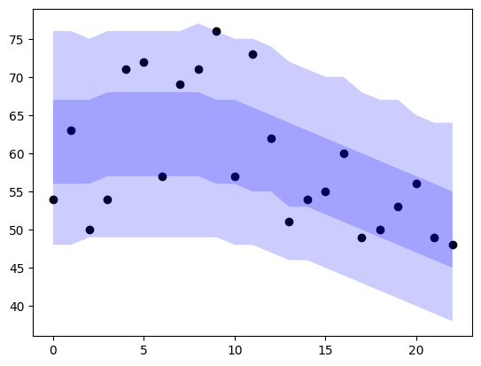 Las bandas representan intervalos de confianza al 50% y 90% respectivamente. Que nos dan a entender que el ajuste no es demasiado allá dado que: