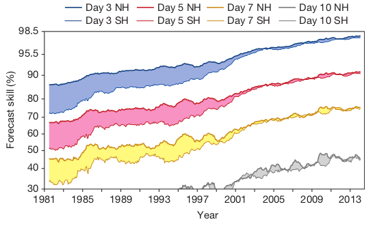 que lo ilustra (aunque omitiré abundar en qué significa el forecast skill: bastará saber que las líneas crecientes indican mejoría y que 100% es la predicción perfecta). El que se pueda comprobar frecuentemente la validez de las predicciones —como sucede en meteorología— permite afinar la tecnología de modo concluyente.
