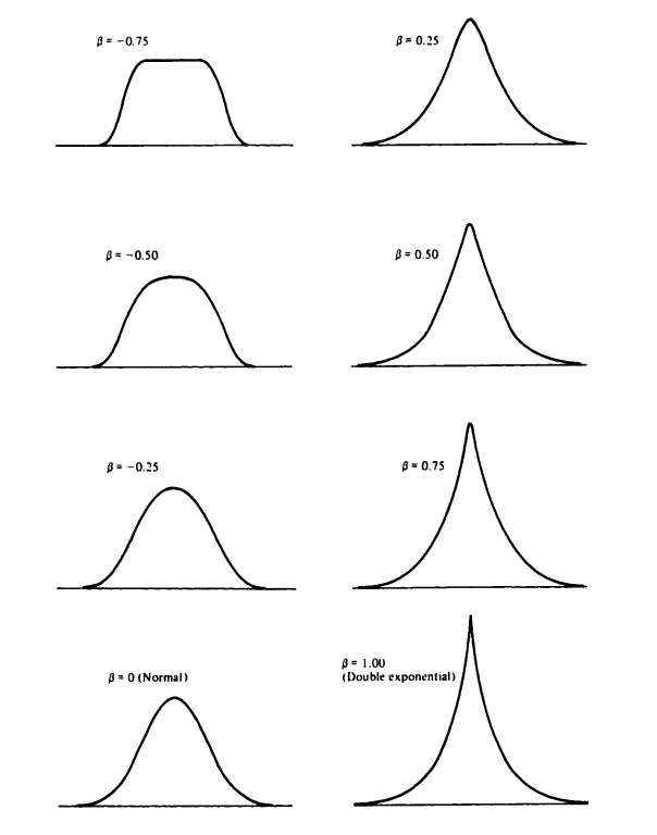 donde $-1 < \beta < 1$ y la normal se recupera cuando $\beta = 1$. El perfil de las distribuciones para distintos valores de $\beta$ es