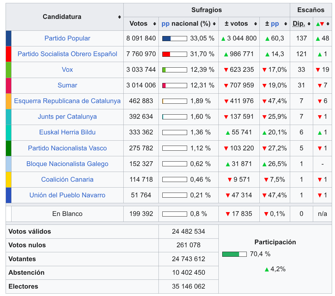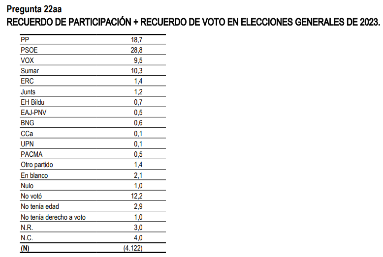 Otra que se realiza en todos los barómetros se refiere a la participación y recuerdo de voto en las últimas elecciones generales, las de 2023 en este caso. Los resultados obtenidos fueron