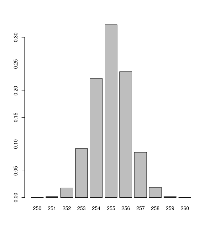 En el caso concreto, la normal tiene una media próxima a 255 y los valores del histograma proceden de una muestra suya redondeada al entero más próximo.