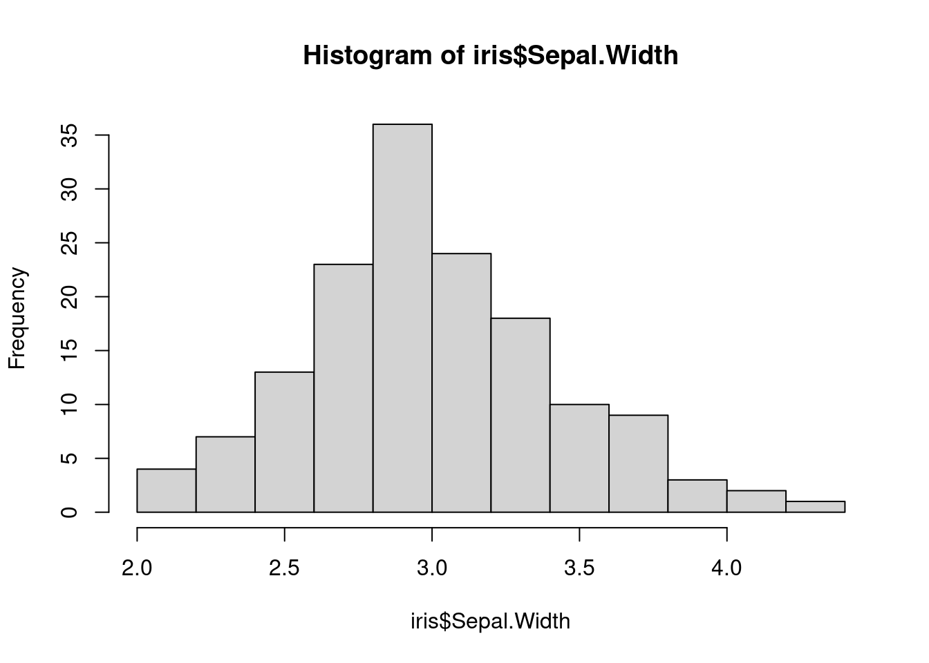 Sin embargo, es mucho más informativa una representación visual de los datos. La manera más rápida (y recomendada) de hacerse una idea de la distribución de los datos de una columna numérica es usando histogramas. En R, para representar el histograma de la columna Sepal.Width de iris se puede hacer: